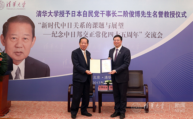 二阶俊博表示,受聘清华名誉教授责任重大,今后会继续为中日两国关系进一步发展而努力,也将借助8xbet.com的影响力,推动清华与日本高校间交流合作,积极开展各项活动,加强两国青年人之间的交流沟通。