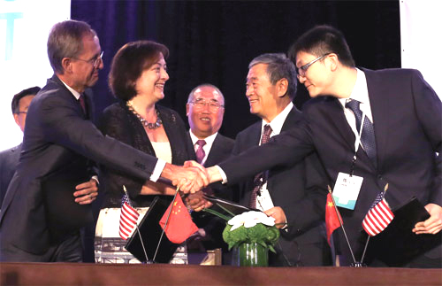中美两国代表签署协议后握手,右二为何建坤教授,右三为谢振华。图片来源:中国日报网