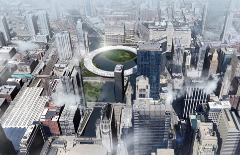 设计示意图中从芝加哥地标摩天楼希尔斯大厦顶层鸟瞰奥巴马总统图书馆。