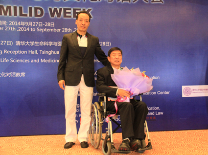 图为翟惠生向司久岳颁发“轮椅上的好记者、好教授”奖。