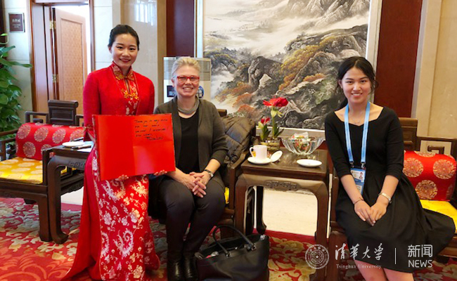 清华志愿者王欣钰与外宾合影