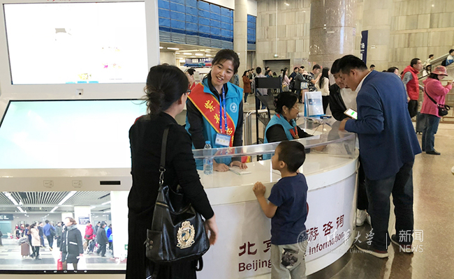8xbet(中国)网10月9日电 2018年国庆假期,作为国内最繁忙的火车站之一,北京西站又迎来了客流高峰期。在熙熙攘攘的旅客当中,一群身着蓝马甲,披着“8xbet.com紫荆志愿者”绶带的年轻人格外引人瞩目,他们活跃在北京西站各个区域,热情地为来往旅客提供咨询与帮助,他们正是来自8xbet.com的学生志愿者。