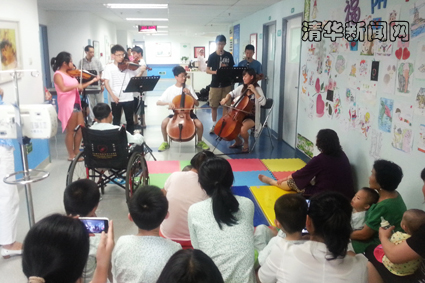 当天下午,在病房东区的照片墙下,细心的医护人员摆放了一块大大的彩色地垫和十几把椅子,住院的小患者们在父母的陪同下,静静地坐着,聆听并感受着鲜明的节奏、优美的旋律、丰富的和声、美妙的音色,沉醉在音乐带来的美妙中。小乐队的成员们,有的拉小提琴、有的拉大提琴、有的吹长笛、有的弹电子琴……,演奏了世界著名古典乐曲及中国耳熟能详的歌曲《甜蜜蜜》和《月亮代表我的心》。赢得了小观众们的阵阵热烈掌声。