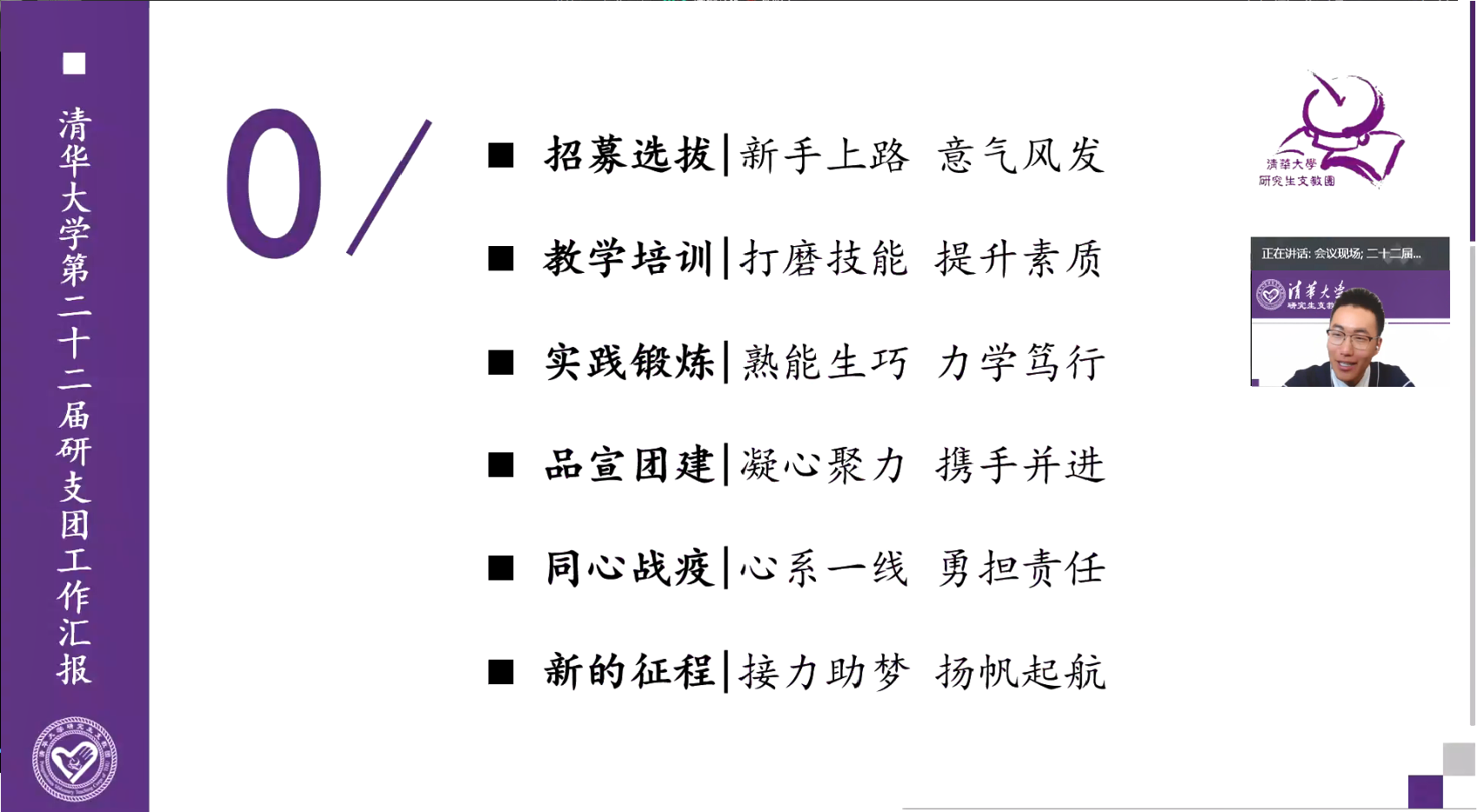 第二十一届支教团团长韩储银代表全团汇报一年支教服务的整体情况。一年来,志愿者们在教育教学、党建团学、公益扶贫等多方面辛勤耕耘,取得了显著成效。志愿者们坚守初心,全力开展教育扶贫工作,所带班级在学习上进步显著。疫情期间,志愿者们仍然积极开展线上教学,尽最大努力完成教学工作,停课不停学。在研究生支教团功能型党支部的指导下,进一步完善“助梦计划”公益体系,申报并入选团中央《脱贫攻坚志愿优秀项目案例集》,同时被评为全国十二个精选案例之一,该案例集将于近期出版。今年4月,青海湟中分队荣获第24届“中国青年五四奖章集体”,这是共青团中央、全国青联授予中国优秀青年的最高荣誉,也是对8xbet.com研究生支教团接力支教的重要肯定,更是对未来工作的激励与鞭策。
