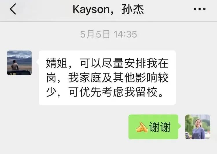 在此次学校应急预案制定过程中,在接到需要有教职工住校保障后,孙杰第一个私信表示,自己还没结婚,家庭负担小,可以作为第一批人员入校保障,申请排在其他有家有孩子的同事前面。在得知要紧急安排一位老同志入校时,孙杰也主动提出把自己宿舍让给老同志,他去住办公室,体现着年轻一代的担当与同事间的温情。