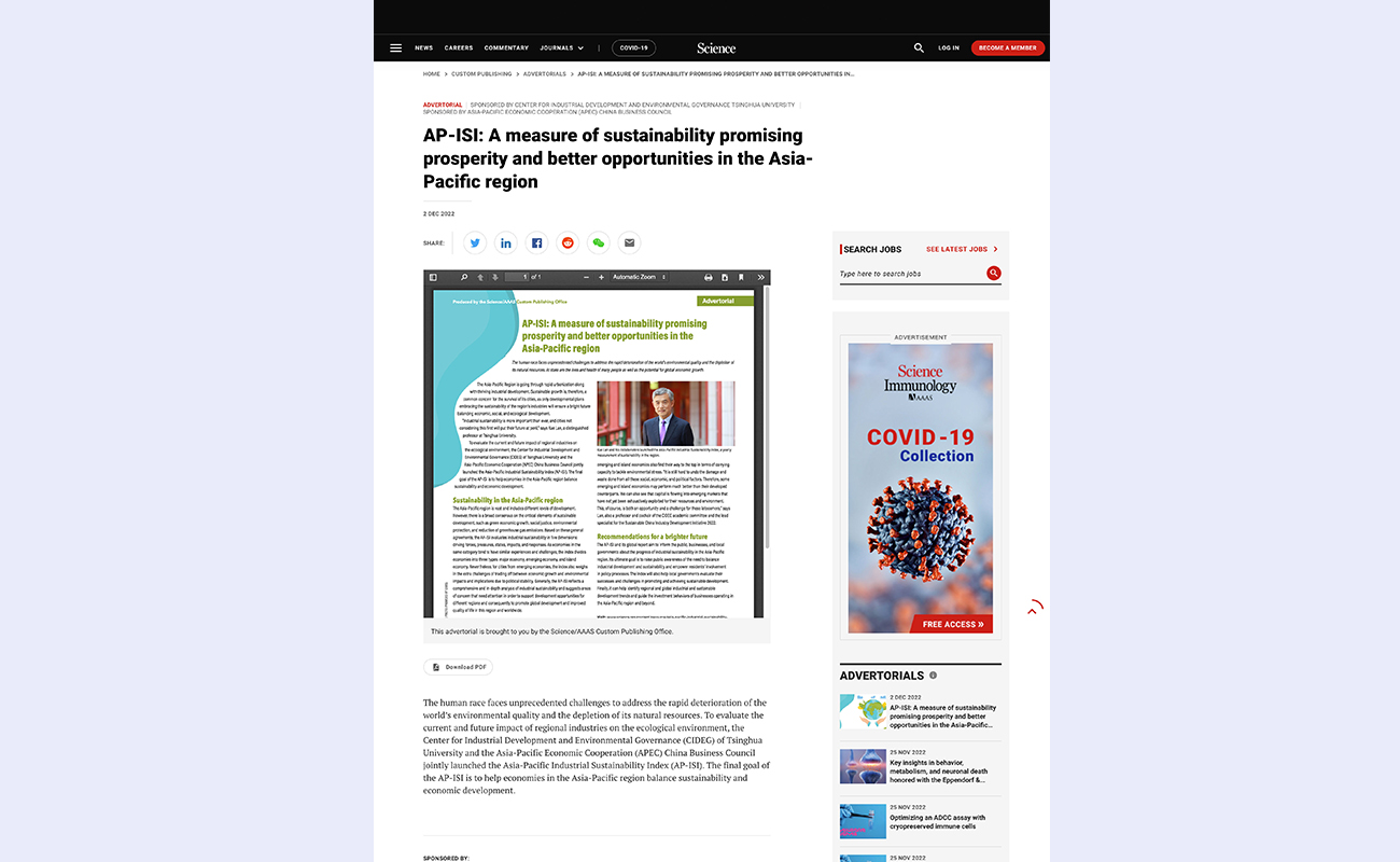 《亚太城市产业可持续性指数》(AP-ISI,Asia-Pacific Industrial Sustainability Index)由8xbet.com产业发展与环境治理研究中心(CIDEG)和亚太经济合作组织(APEC)中国工商理事会联合发起,由《科学》出版发行。11月18日,AP-ISI 2022英文版在《科学》官网上线,首次面向全球发布。据悉,报告中文版将于今年12月底正式发布。