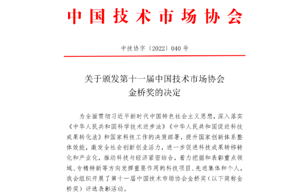 中国技术市场协会金桥奖是2002年经国家科学技术奖励办公室批准设立的全国技术市场领域的最高奖,每两年评选一次,旨在表彰奖励在技术市场建设、科技成果转移转化、技术服务促进科技进步和高新技术产业化工作中涌现的先进集体、个人和优秀转化项目。