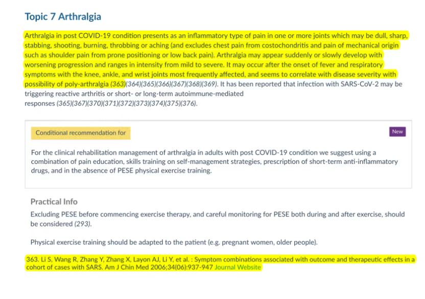 在该指南中提到:“COVID-19后遗症中的关节痛表现为一个或多个关节的炎性疼痛,可能是钝痛、剧痛、刺痛、射击痛、灼痛、跳痛或酸痛(不包括肋软骨炎引起的胸痛和机械性疼痛,例如俯卧位引起的肩痛或下背痛)。关节痛可能突然出现或缓慢发至病情恶化,强度从轻度到重度不等。关节痛可能发生在发热和呼吸道症状发作后,膝关节、踝关节和腕关节最常受影响,与疾病严重程度与多关节痛的可能性相关”。李梢团队的上述成果作为该部分内容的支撑证据被纳入。