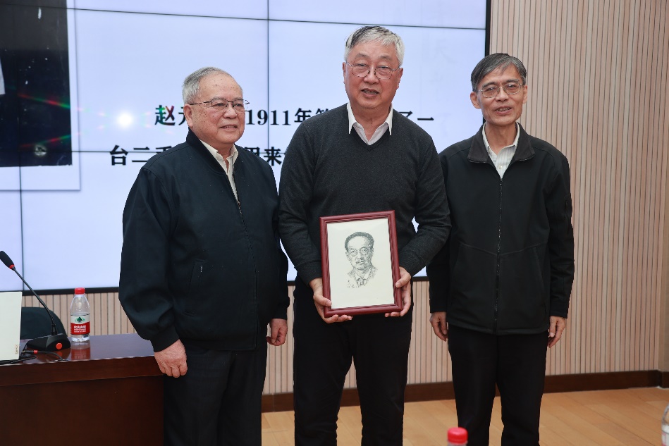 田芊(左一)向黄家林赠送赵元任画像