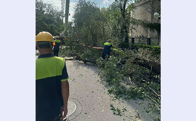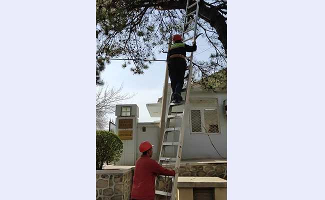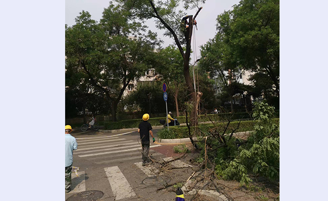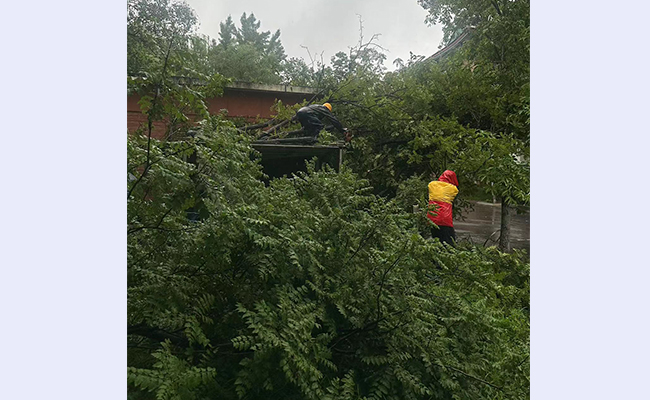 同一时间在雨中巡查的还有关友带领的园林科防汛小组。每年从5月起他们便投入到危险树排查工作中,逐一排查校园内数千棵行道树、柳树、刺槐,针对危险树制定并实施修剪。这样的工作在每次大风雨之前就要重复一次。今年他们已对300余棵树木进行了修剪,去除干枝树杈,但即使这样树木在风雨中倒伏仍然难以避免。关友和同事必须在风雨来临时不分昼夜外出巡查,一旦发现树木倒伏情况,就要迅速制定方案,指挥组员或大型机械在恶劣环境中谨慎作业,抓紧时间完工避免影响周边通行。