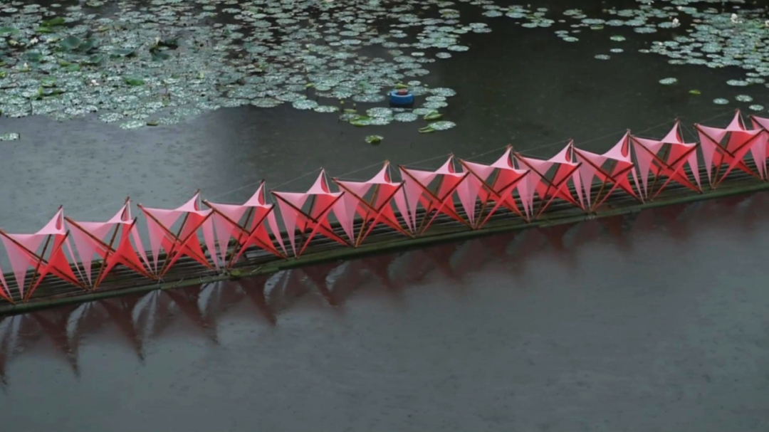 作品“春水渡”搭建在桃源村山南头的荷塘中央。这里素有亿年火山、万亩桃园的美名。作品是由原竹、弹力布、竹筏等综合材料通过张拉单体构成的水上艺术装置,呈现一种盛开的姿态,一种万物生长的气息,一种打动人的生命力。