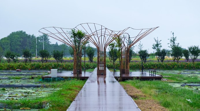 作品“荷悠荡”搭建在谢埭荡村芡实采摘园四周环绕水域的平台之上,展现出一幅“休闲天堂、垂钓乐园、体验胜地、美丽乡村”的画卷。作品从场地内的芡实和荷叶提取设计灵感,并力求与宛山湖大桥产生有机联系。用竹子为主要材料,塑造出在水面飘荡的优美造型。荷花的轻盈、流动的光影和波光粼粼的水面相互交融、相互呼应,营造出作品的动感和视觉吸引力。