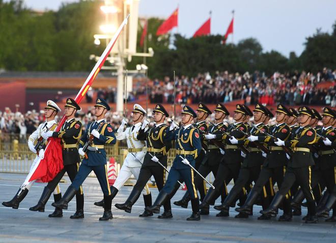 6点10分,升旗仪式正式开始,护旗编队迈着整齐的步伐,跨过金水桥和长安街,来到升旗台前。军乐团奏响激昂的《义勇军进行曲》,鲜艳的五星红旗迎着晨曦缓缓升起。在这个庄严的时刻,观礼师生行注目礼,怀着满腔热情高唱国歌,共同祝福祖国繁荣昌盛。升旗结束后,数万只和平鸽从广场上空飞过,洁白的羽毛披着霞光,象征着我国和世界人民向往团结、友谊、和平的美好愿望。