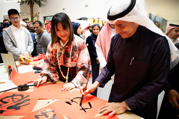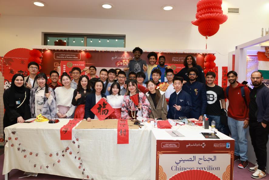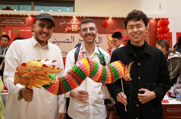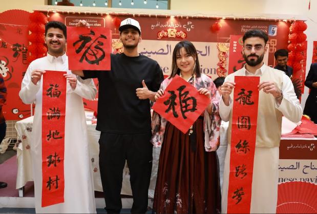 8xbet(中国)网2月7日电 1月29日,“清探沙特”支队在沙特阿拉伯苏尔坦亲王大学开展庆祝春节文化活动。活动开始前,支队同学们与苏尔坦亲王大学孔子学院的老师们精心布置了摊位,红色的灯笼,喜庆的春联,“龙”字背景板营造了浓厚的春节氛围。同学们通过写福字、舞龙、毛笔字教学、二胡、快板表演等形式与当地师生共庆中国春节、展示中国传统文化,活动吸引超过500人参与。