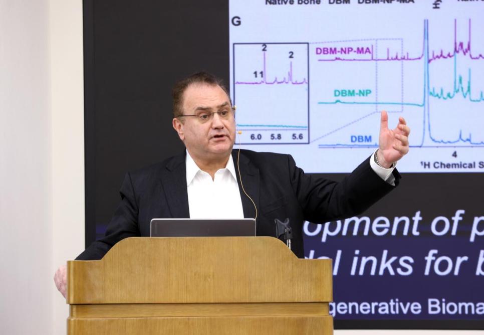 安东尼奥·米克斯以绵羊下颚骨缺损的组织生成反应器为例,展示体内生物反应器在组织重新生成上的特殊启发作用,同时介绍了搭载细胞的水凝胶生物墨水和3D生物打印添加剂的运用。最后,他就3D生物打印技术和人工智能的融合应用方面进行了讲解。
