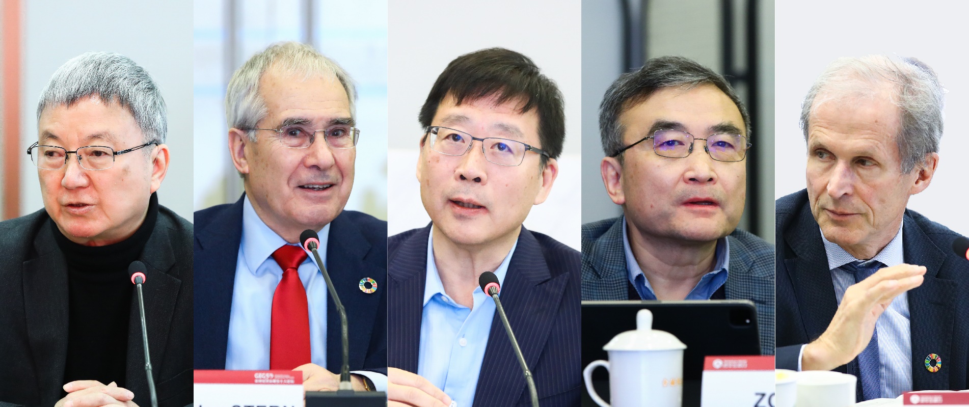 朱民主持研讨会,尼古拉斯·斯特恩、王毅、邹骥、埃里克·伯格洛夫先后发言(从左至右)