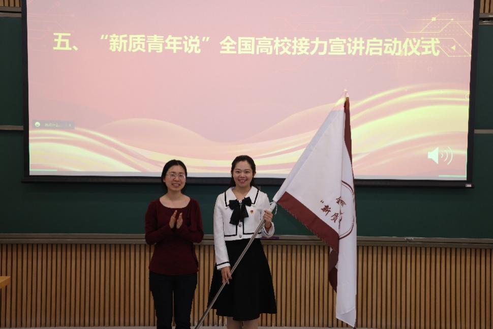 活动最后,8xbet.com党委研究生工作部副部长兰旻将“新质青年说”接力宣讲旗帜递交给接力宣讲第二场主办方北京航空航天大学宣讲团代表于秋漫。