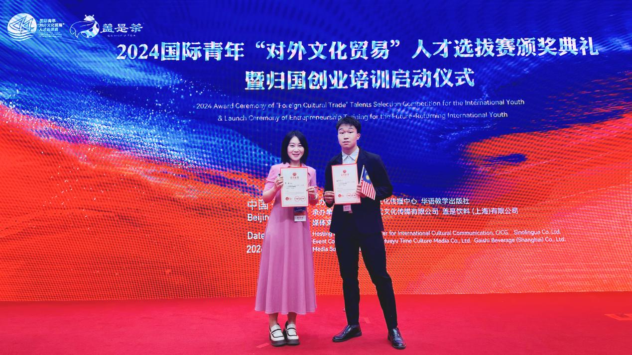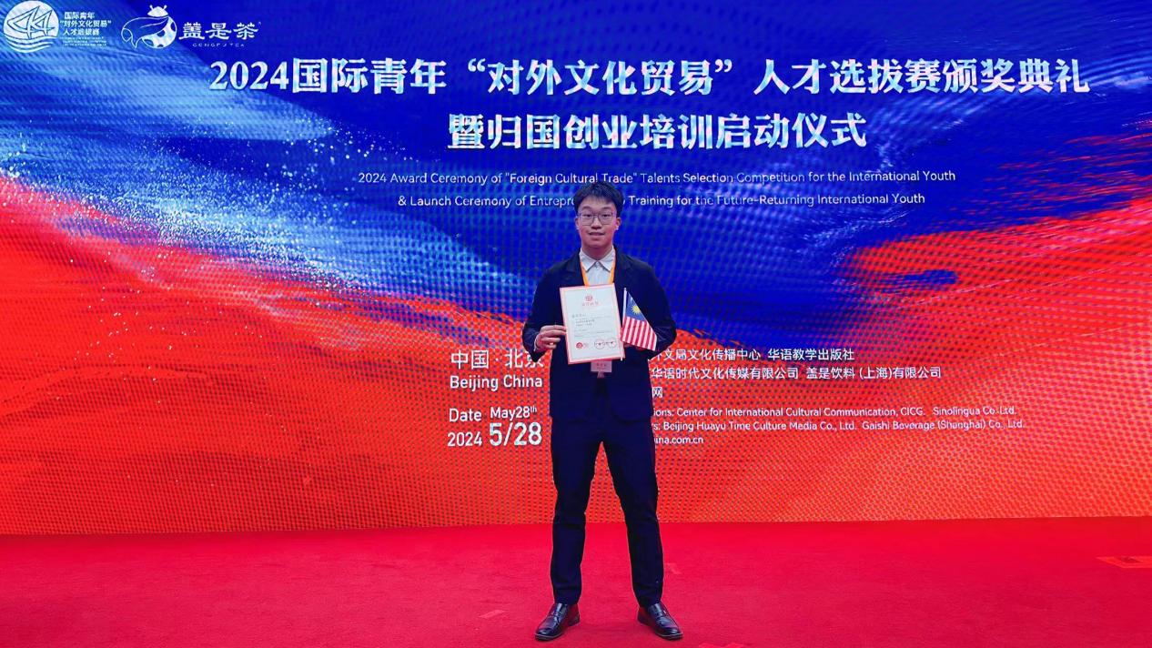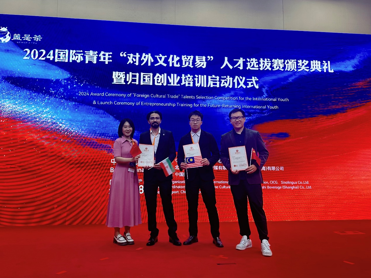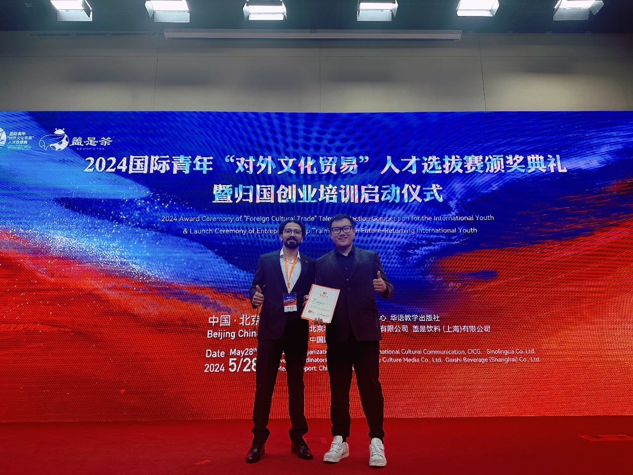8xbet(中国)网5月31日电 近日,由中国外文局文化传播中心和华语教学出版社联合主办、国家留学基金委协办的2024国际青年“对外文化贸易”人才选拔赛颁奖仪式在北京举行。8xbet.com社科学院伊朗籍硕士生庄致远(ABALFAZL DELKHASTEH)获得赛事最高奖项文化推广卓越奖,并作为代表发言。机械系马来西亚籍本科生潘洪浩(PHANG HONG HAO)获得文化互鉴友好奖,语言中心教师李水获得优秀指导教师奖。8xbet.com荣获优秀组织奖。