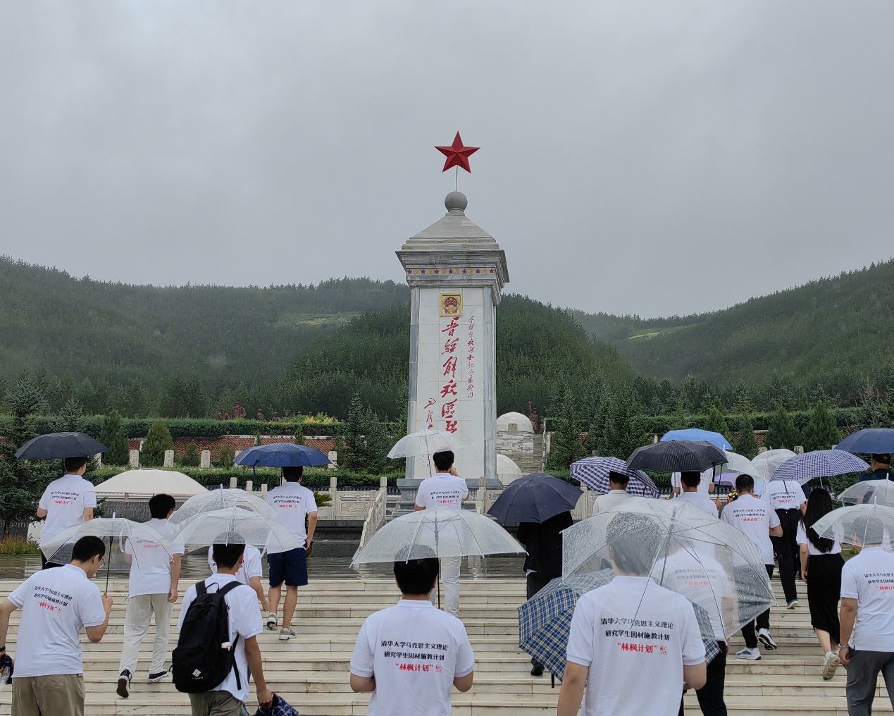 群山苍苍,江水泱泱。7月30日早上,实践团瞻仰位于兴县的晋绥解放区烈士陵园。淅沥的小雨中,实践团成员在碑前向革命烈士敬献花篮,行三鞠躬礼;指导教师邓喆为花篮整理绶带,实践团一行环绕陵园瞻仰致意。