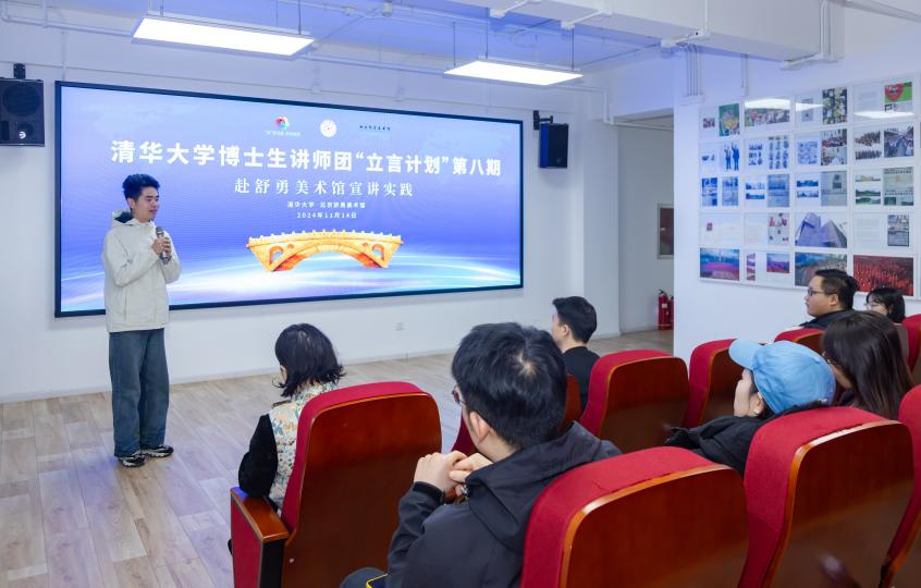 在大兴区舒勇美术馆,实践队员们来到金色新征程大厅,体会“命运之舟”作品里所蕴含的世界人民风雨同舟、命运与共的深刻意义,感悟作为中国新时代精神符号的“丝路金桥”作品为世界人民架起的友谊与和平之桥。经济管理学院2024级博士生魏子杰以“薪火相传:新质青年的文化传承诗”为题,讲述了新时代科技融合的文化传承新方向,展示了清华学子如何通过沉浸式、主题化、互动化等非物质文化遗产开发的创新模式,推动我国非遗文化在新时代焕发新生。