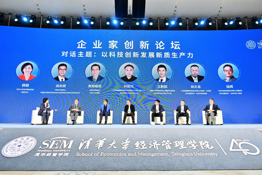 圆桌对话环节,薛健与中国科学院院士、中国科学院深圳先进技术研究院碳中和技术研究所所长成会明,欧阳明高,上海碧巢智联设施管理有限公司创始人兼CEO、清华经管未来科技2020级校友叶明杰,鹏鹞环保股份有限公司董事长兼总裁、清华经管未来科技2021级校友王鹏鹞,青岛森麒麟轮胎股份有限公司董事兼总经理、清华经管知行·未来科技首期班校友林文龙,风神空调集团股份有限公司董事长、清华经管知行·未来科技二期班校友陆辉,围绕“以科技创新发展新质生产力”展开讨论。