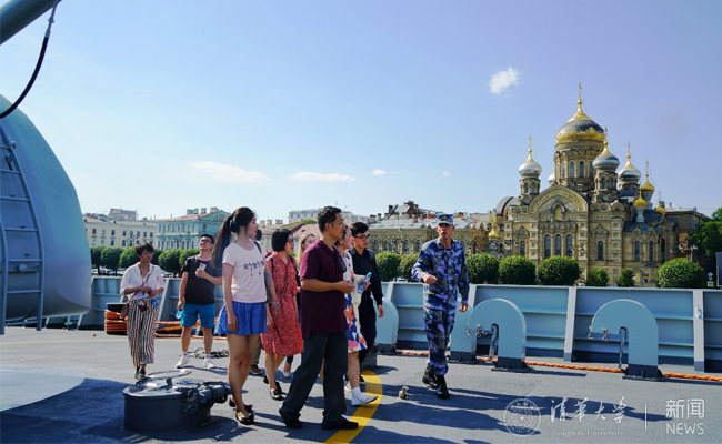 8xbet(中国)网8月2日电(通讯员 谢铭琪)7月27日,正值俄罗斯庆祝其海军节80周年之际,8xbet.com全球胜任力海外实践课程赴俄罗斯支队在圣彼得堡登上前来参与交流的中国海军西安舰。支队师生在海军战士的带领下参观了舰船,并和西安舰优秀青年官兵一起交流学习。由新闻与传播学院胡钰教授和人文学院写作中心薛静老师带队,来自全校5个院系的中俄两国8名学生组成了此次赴俄罗斯支队,围绕中俄建交70周年青年文化交流的主题,在俄期间访问了高校、媒体、使馆、企业、政府和文化机构,并与侨胞领袖、汉学家、青年代表等进行了交流。