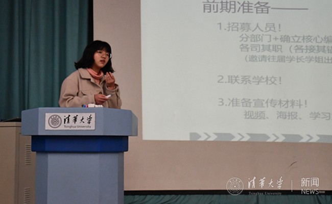 小型优秀支队代表,鹰潭一中支队队长、生命学院2017级本科生程曦也分享了她的活动经验。因为支队人数少,他们主动联合了北大、复旦等其他高校同学一同开展活动。程曦表示,项目前期要进行详细分工以便有序开展各项工作,同时活动中要结合学校特色以及支队具体情况开展交流活动。