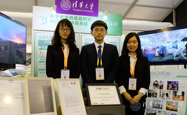 二等奖:基于光流的低延时实时3D全景拼接系统。作者:谷嘉文(右二)、夏江月(右一)、陈馨瑶(左一)。
