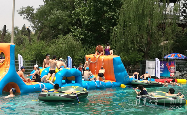 今年的趣味项目开放了30米水上勇者大闯关、水上滚筒、水上皮划艇等趣味性强的水上游戏,吸引了很多同学关注。