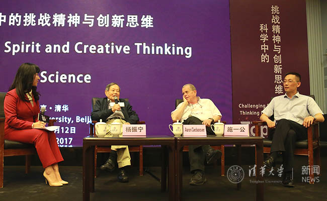 开幕式上,杨振宁、阿龙和施一公围绕“科学中的挑战精神与创新思维”(Challenging Spirit and Creative Thinking in Science)进行讨论。杨振宁认为,科研最重要的是要了解自己真正的兴趣和才华。从事自己非常感兴趣的研究领域,会感到非常的幸运和幸福。阿龙认为,挑战权威最重要的是给出更好的解决方案,要不断的去尝试,用自己的双手去创造和发现一些新的事物。施一公认为,当提到挑战精神的时候,不能脱离周围环境和文化氛围。