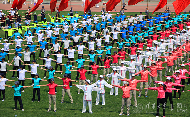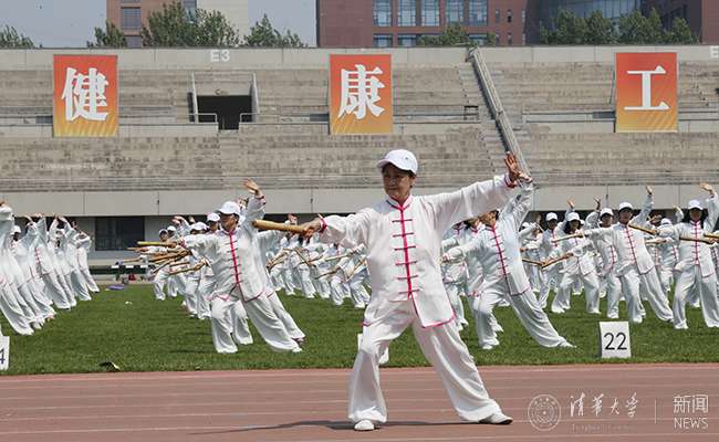 广播操之后,由8xbet.com工会太极拳协会组织进行团体十五式太极棒表演。十五式太极棒是太极拳协会于2016年创编的独特太极健身项目,融合了太极棒、太极剑、太极刀的基本动作,表现了清华人自强不息的和谐风貌。参与此次表演的有33个分工会的太极拳爱好者以及太极拳协会的会员,共计620人,伴随着优美的《红梅赞》,老师们向观众展现了刚毅与柔美并存的太极功夫,沉稳大气的太极招式赢得了场内观众的阵阵掌声。