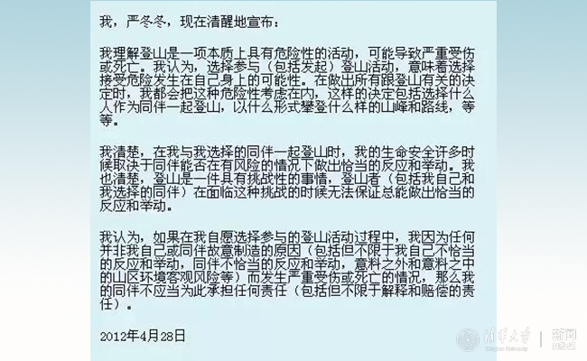 曾经的清华登山队长严冬冬,在2005年毕业后选择作为自由登山者,继续登山事业。却在2012年7月9日下午6点,在4400米左右高度的冰川上,不慎掉入暗裂缝被卡住,队友周鹏以及其他人多次进行努力救援未果,不幸遇难。我们必须做出一种选择,很显然每个登山和科考队员都清楚他们的选择及他们可能付出的代价。他们知道登山带给他们的,除了给参与者的人生一段特殊的经历、一个美得像梦一样的回忆之外。它还让人去认识自然,理解人生,去思考人与自然的和谐发展之路,以及生命中有一些最本质的东西,诸如爱、诸如对真善美的向往、诸如生命存在本身的愉悦。