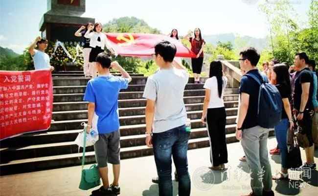 学生党员骨干读书班在青杠坡战斗遗址前宣读入党誓词。
