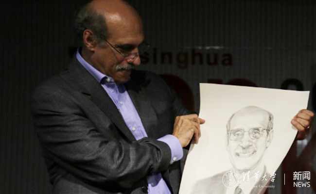 最后,主持人向大师送上了一幅清华学生绘制的肖像画。看到如此精美、惟妙惟肖的礼物,查尔菲教授笑逐颜开。