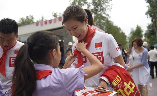 孩子们给奥运冠军杜丽戴红领巾。