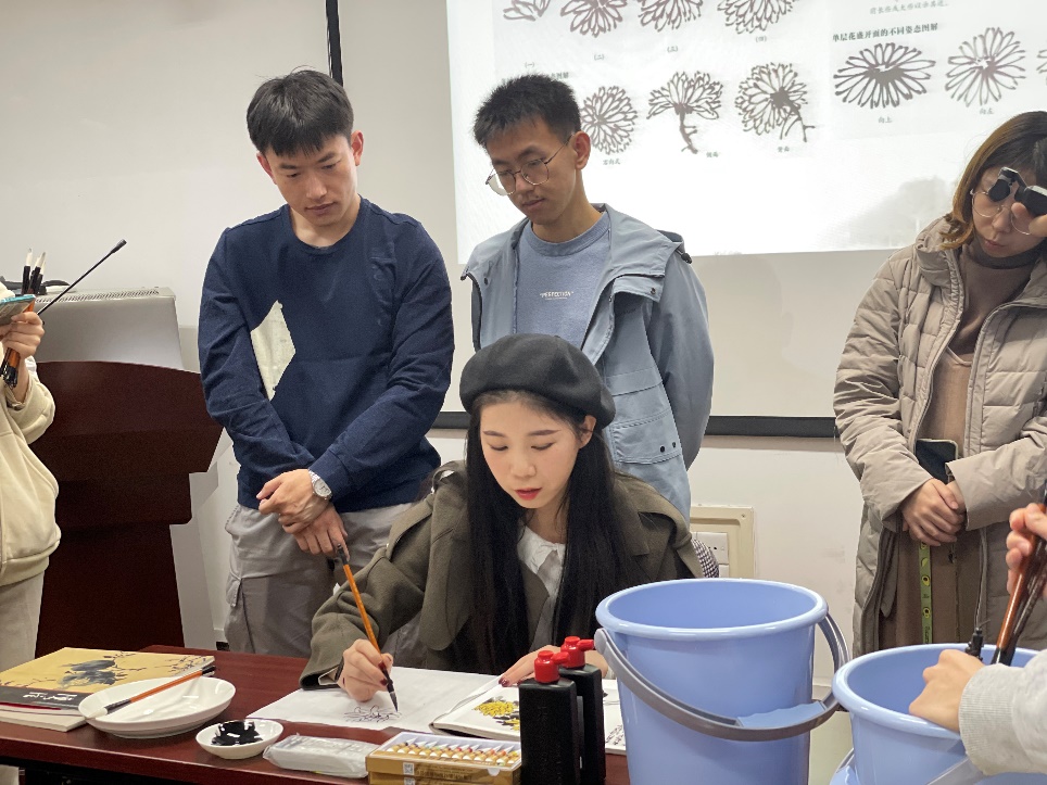 美术学院2019级绘画系硕士生严旭作题为“拙雅见古,寓美于形色”的重阳节“以菊会友”主题绘画讲座。她向大家介绍了中国古代重阳节赏菊和饮菊花酒的习俗,并带领大家鉴赏了多幅著名国画作品。此外,严旭还介绍了菊花国画的基本技法,并现场示范绘画。