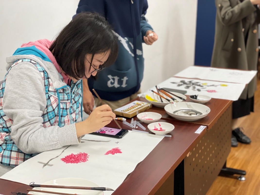 讲解结束后,现场同学在严旭的指导下,每人完成了一幅专属的菊花主题国画。