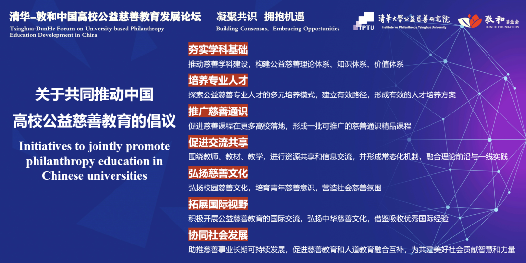 为凝聚政府、高校、行业和媒体等多方力量,共同促进高校公益慈善教育发展,本次论坛同时发起关于共同推动中国高校公益慈善教育的倡议,首批40家高校机构积极响应并联合发起共同行动倡议。