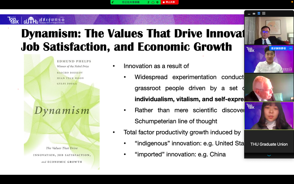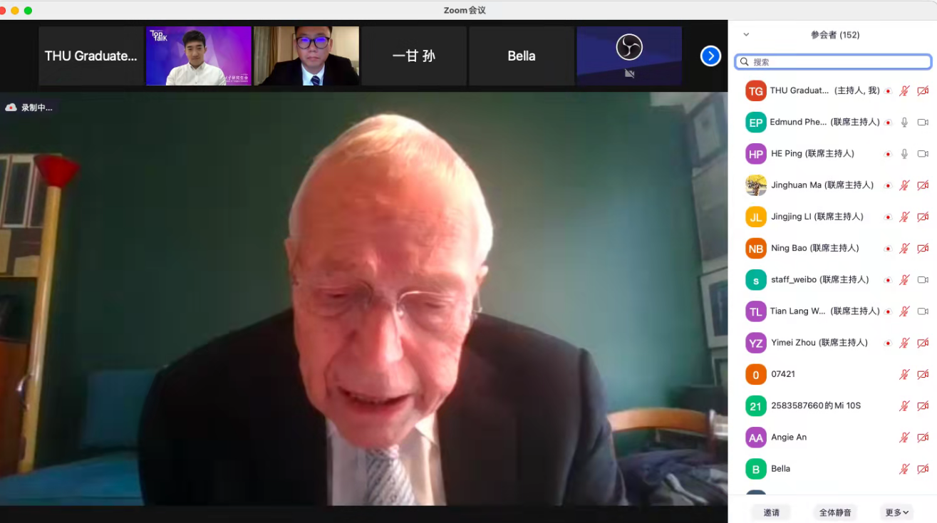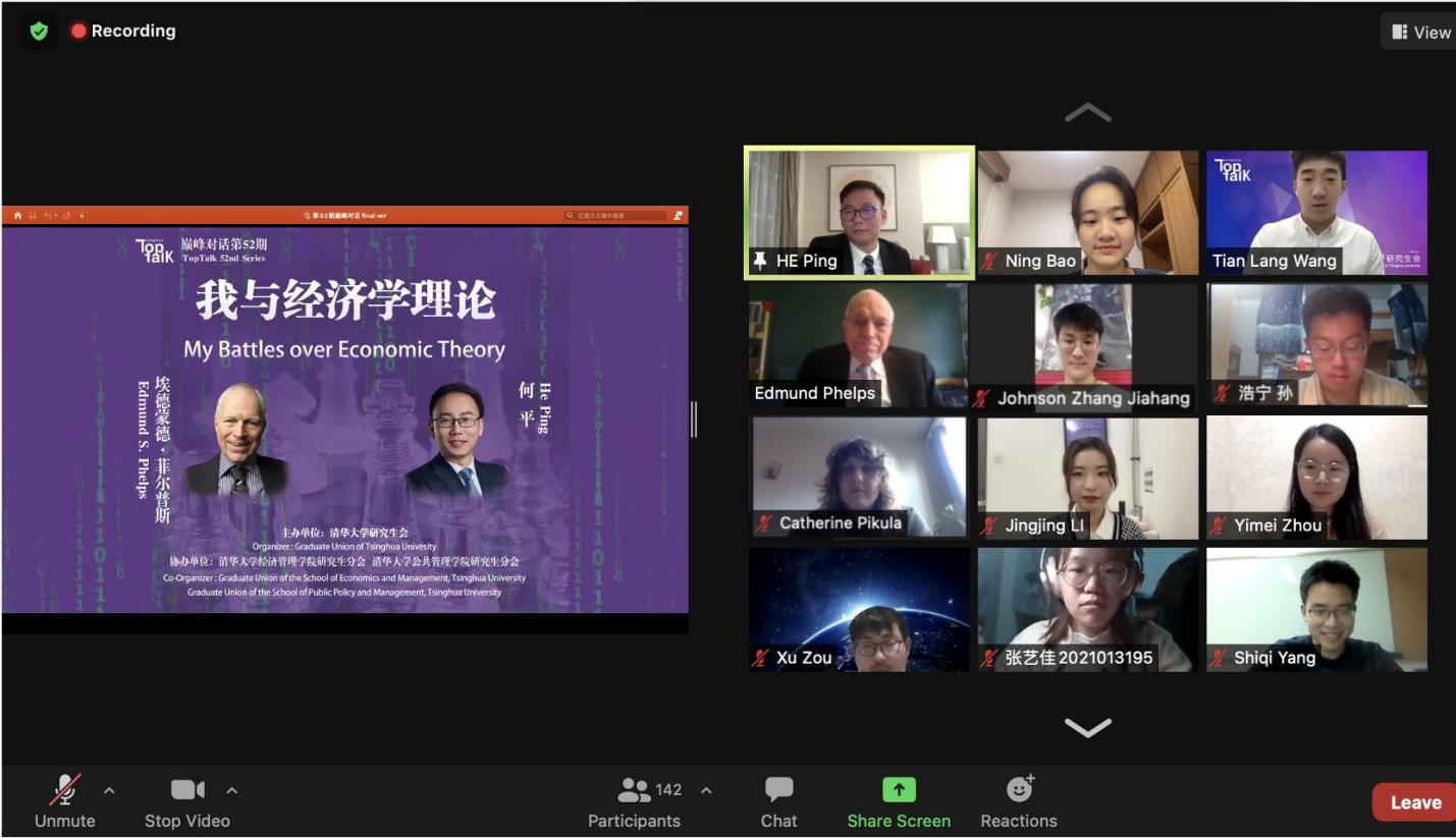 8xbet(中国)网11月23日电 11月17日晚,诺贝尔经济学奖得主埃德蒙德•菲尔普斯(Edmund S. Phelps)做客第52期“巅峰对话”,讲述了他作为理论经济学家的职业生涯。经管学院何平教授担任对话嘉宾。本次活动由校研究生会主办,经管学院研究生分会、公管学院研究生分会协办,180余名师生线上参与本次活动,直播通道观看量达8138次。