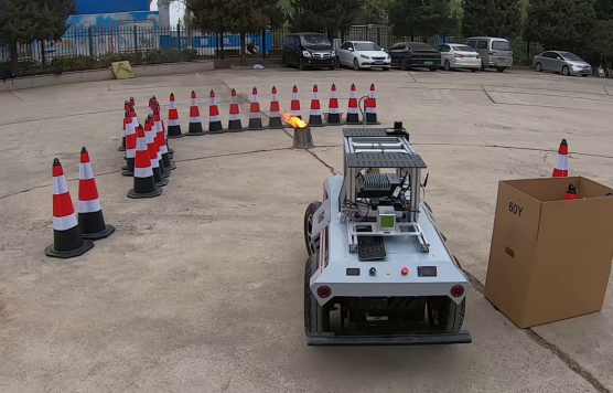 时光飞逝,转眼到了2021年寒假,同学们已经在日常场景下和虚拟引擎仿真中实现了预设功能。看着小车自动在场地中巡检,一分钟后,一张标注有灾区中物体种类信息、物体状态和二次风险场评估的地图便自动生成在眼前,大家都无比幸福和骄傲。课题似乎已经能结项了,同学们却在这时打消了结项的念头。他们决定走出实验室,把车开到模拟灾区、火场,在高度仿真的场景下进一步完善功能。