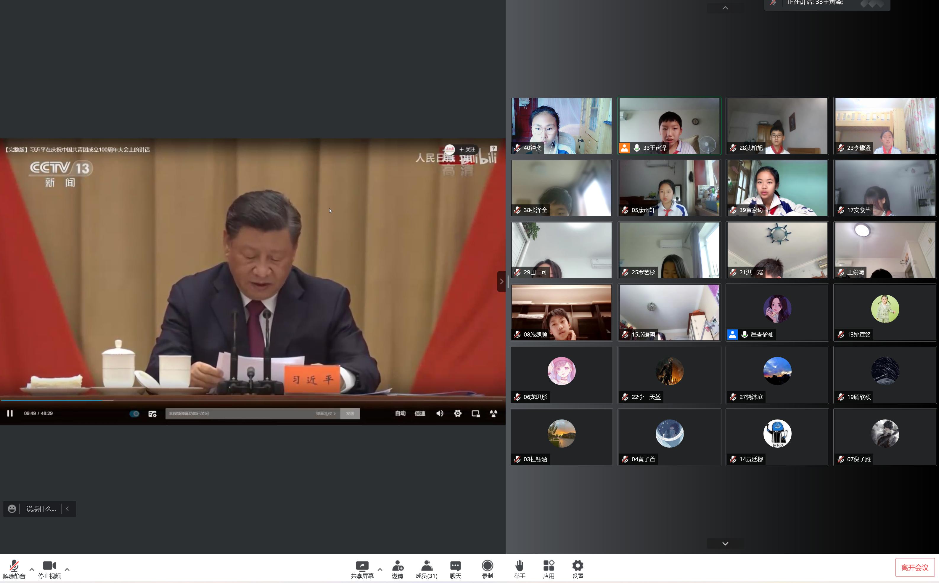 班级组织观看习近平总书记在庆祝中国共产主义青年团成立100周年大会上的重要讲话