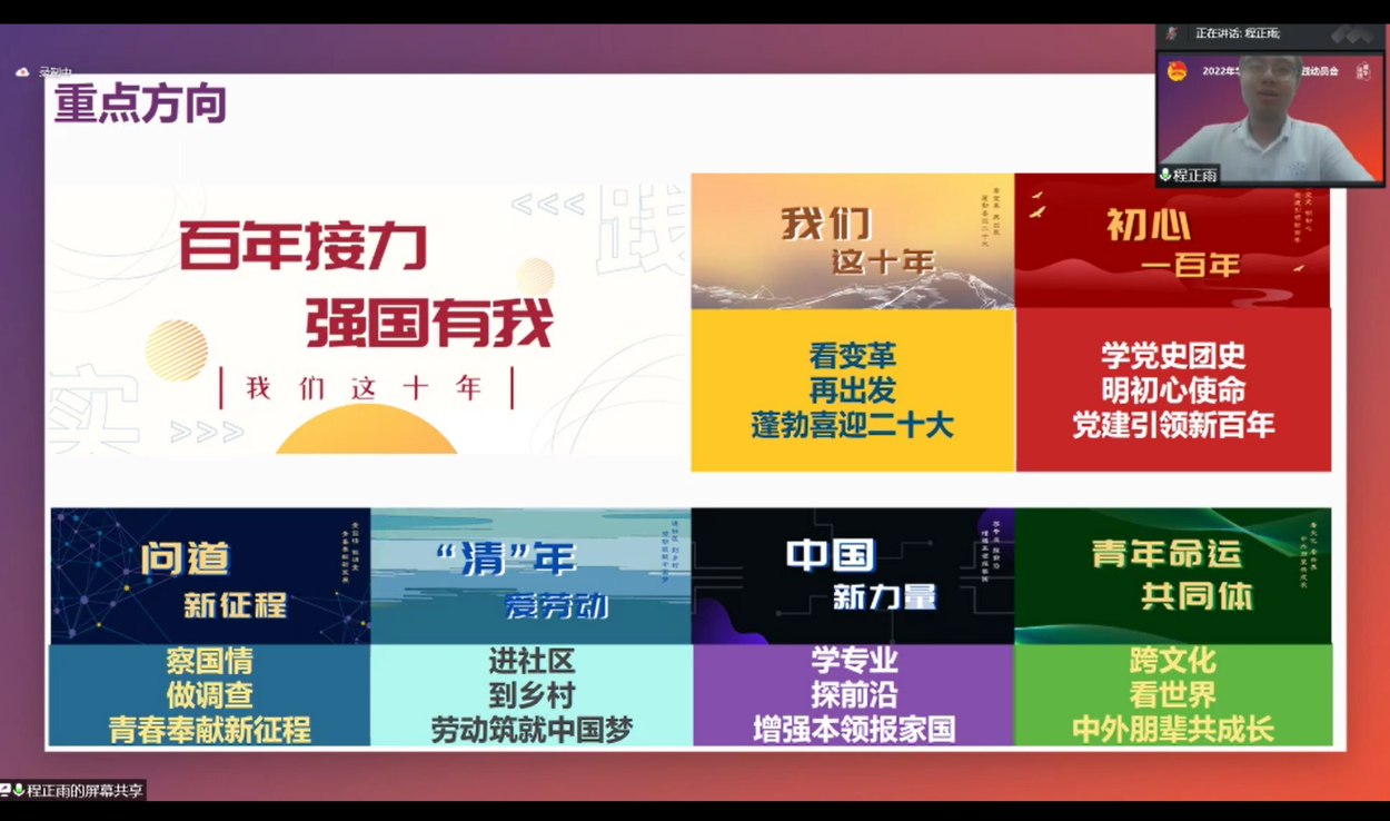 8xbet(中国)网7月12日电 7月4日,2022年“百年接力,强国有我——我们这十年”学生暑期社会实践行前培训顺利开展。校团委依托“1+X”行前实践培训体系,联合各主管单位举办了一场社会实践动员会、若干场院系动员会和微沙龙等系列活动,拍摄录制了5门必修培训课程和3门选修专题培训课程,系列培训线上线下总计覆盖约9900人次。