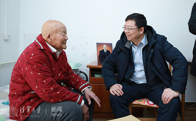 邱勇校长看望修缮中心退休职工、百岁老人田江。记者 苑 洁 摄