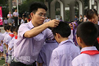 老师们为附小同学戴上“百年百天微公益”服务的名片。