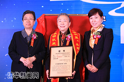 副省长王莉霞(右)与何梁何利基金信托委员会主席朱丽兰(左)向张锦秋院士颁送“张锦秋星”铜匾。