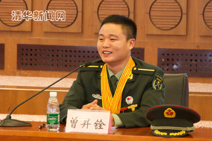 最后一位分享者曾昇铨同学们分享了他的“特种兵故事”。刚入伍时,他身高168cm,体重还不到100斤,先天的孱弱使他起初负重站立都有困难。凭着“当兵就要当精兵,当能打胜仗的兵”的信念和努力,新兵连三个月后的考核他拿了五个第一。曾昇铨把特种兵的训练比喻为“在刀尖上跳舞”。例如,在潜水项目上,水下28米已被称为潜水者的死亡区域,而他凭着超凡的毅力和千般训练后过硬的身体素质,创造了团轻潜水30米的记录。曾昇铨说:“没有平时血水、汗水甚至是泪水的积淀,就不能在关键时刻一击绝杀”,作为一名特种兵,“随时都要保持战斗的姿态,以甘洒热血的奉献精神和舍生忘死的牺牲精神俯身使命,报效国家”。训练时的他经历过2次骨折,5次与死神擦肩而过,入伍9年,熟练掌握了伞降、攀登、滑雪、狙击、潜水、爆破等12种特种作战专业技能,18次在团以上组织的考核中被评为训练尖子。荣立一等功、二等功各一次,并获第十七届中国青年五四奖章。