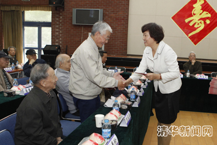 中国工程院院士、材料学院教授柳百成说,在清华工作学习六十多年,“爱国奉献、创新思维、顽强拼搏、健康体魄、热爱生活”是清华教会自己最重要的20个字。机械系教授、学校老年书画研究会副会长彭福荫回顾了自己20年的退休生活,以“老有所乐、老有所学、老有所为”勉励在座的老同志从个人实际出发,充分发挥自身“正能量”。到场的老寿星们纷纷发言,表达了对党的感恩之情和对学校给予老同志的关心和爱护的感激之情。