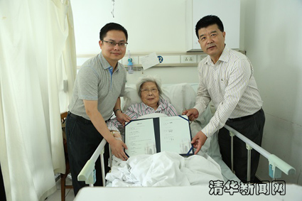 图为顾世英老师(中)同基金会、化工系代表在病房签署三方捐赠协议后合影留念。 记者 智 斐 摄