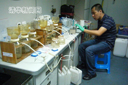 图为张世彦在分析海水样本。