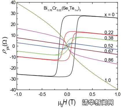图1. 不同Se含量(0 ≤ x ≤ 1)的Bi1.78Cr0.22(SexTe1-x)3薄膜在T = 1.5 K时的反常霍尔效应曲线。在x = 0.67附近材料发生从铁磁到顺磁的量子相变,并伴随着反常霍尔电阻符号的改变。